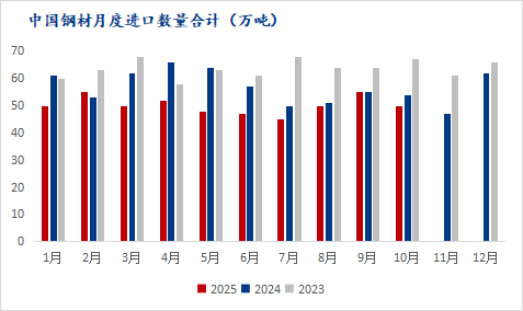 二、10月鋼材出口同比由增轉降2025年10月,中國鋼材出口量為978萬噸,環(huán)比減少6.6%,同比減少12.3%;1-10月累計出口鋼材9774萬噸,同比增長6.6%。進口方面,10月鋼材進口量為50萬噸,環(huán)比減少9.1%,同比減少6.2%;1-10月累計進口504萬噸,同比減少11.9%。2025年10月,我國鋼材出口同比今年首次由增轉降,主要受兩方面因素影響:一是去年同期出口基數(shù)較高,達1118萬噸,為歷史次高月度水平;二是此前因趕船期提前透支的部分增量已在9月出口數(shù)據(jù)中顯現(xiàn)。