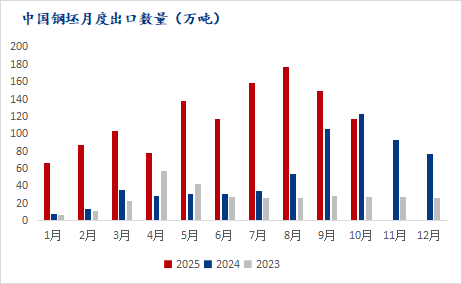 五、鋼坯出口量減價增1、10月鋼坯出口同比轉降 2025年10月,中國鋼坯出口量為117.4萬噸,環(huán)比下降21.4%,同比下降4.3%,為今年以來首次出現(xiàn)同比負增長;1-10月累計出口1190.4萬噸,雖仍保持156.9%的同比增長,但累計增速已呈現(xiàn)收窄態(tài)勢,表明此前支撐出口的高增長動能明顯減弱。