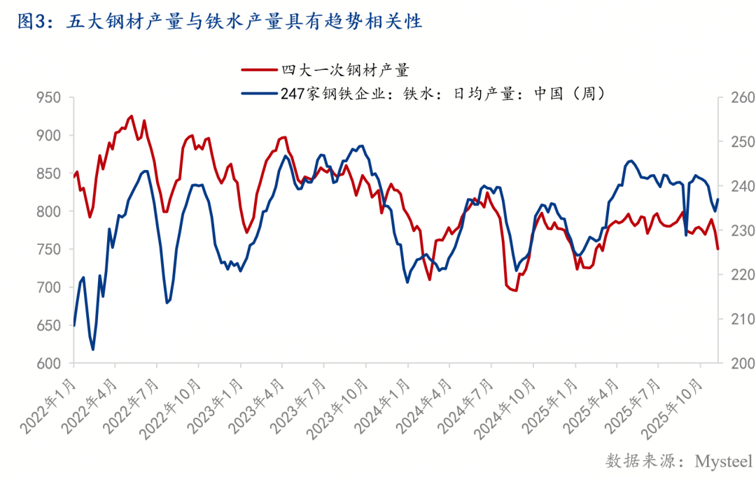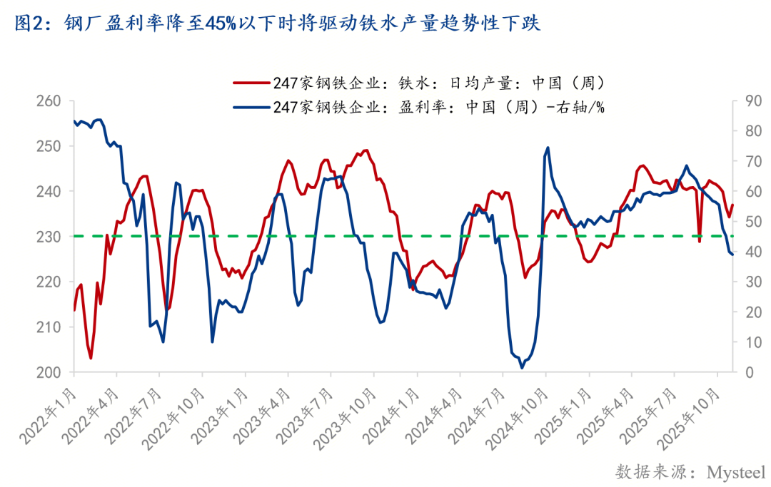 當前鋼市運行的核心邏輯是負反饋,根源在于需求淡季下的鋼材去庫壓力,而歷史上鋼市負反饋行情多發生在“金三銀四”及“金九銀十”旺季,最根本原因是旺季鋼材去庫不及預期。歷史規律顯示,鋼材去庫拐點通常比鋼廠盈利率拐點提前15-30天,核心邏輯是:旺季初期去庫乏力矛盾未顯現,鋼廠盈利仍上升;后期去庫乏力引發市場對供應過剩的判斷,進而通過打壓利潤倒逼鋼廠減產。鋼市負反饋觸發的根本條件是旺季鋼材庫存去化不及預期,而利潤水平則是決定鋼廠是否減產的直接原因——庫存去化不及預期會導致鋼廠盈利率下降,降至一定水平后鋼廠將通過減產緩解供應壓力。2022年以來的歷史經驗顯示,當鋼市供過于求、庫存去化乏力時,打壓鋼廠利潤倒逼減產是唯一緩解矛盾的途徑,且存在明確規律:鋼廠盈利率拐點領先鐵水拐點約兩個月,盈利率降至45%以下鐵水產量才會趨勢下跌,降至10%-25%中樞水平鐵水產量才見底。鋼市負反饋的核心目標是通過倒逼鋼廠減產,緩解供應過剩導致的鋼材庫存去化乏力問題,評估減產程度的關鍵指標為Mysteel247家日均鐵水產量(與五大鋼材產量存在趨勢相關性,且今年以來比值均值約為1.93)。以2022-2023年國慶節后(與今年同期庫存高點相當、去庫節奏雷同)的去庫表現為參考,從去庫速率(今年21萬噸/周vs兩年均值46萬噸/周)和去庫降幅(今年8%vs兩年均值17%)兩個維度進行推算,結論便是鐵水產量均需從國慶后高點242萬噸/日降至200萬噸/日左右,才能實現去庫節奏趨同;然而當前鐵水產量在236萬噸/日,理論上仍有36萬噸減產空間。理論推算的鐵水平衡低點200萬噸/日,低于過去四年負反饋行情下的鐵水最低值213萬噸/日,凸顯今年國慶后鋼材庫存去化動能極度羸弱。但Mysteel排產調研顯示,未來鐵水低點或在228-230萬噸/日,與理論值存在差距,核心原因在于鋼廠盈利水平。因此,后續需重點跟蹤鋼廠盈利變化,這是影響減產落地程度及庫存去化進程的關鍵因素。