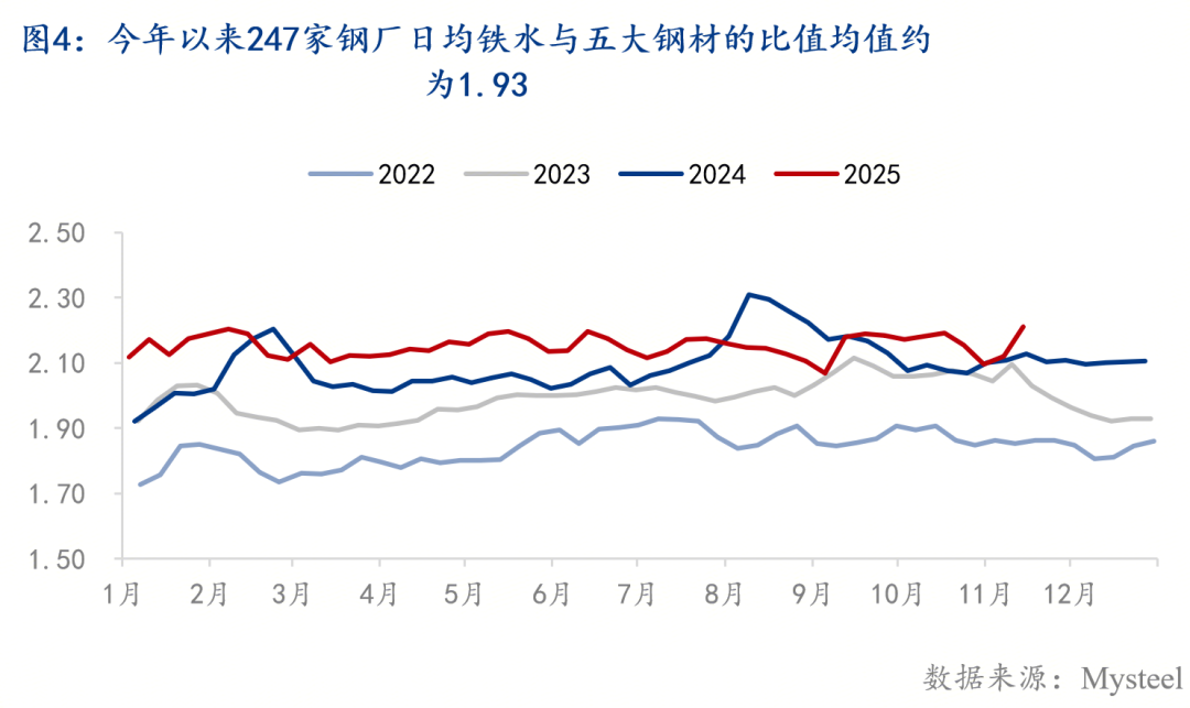 鋼市負反饋的最終目的在于倒逼鋼廠減產,以此緩解供應邊際過剩所帶來的鋼材庫存去化乏力的壓力,那么減產需減到何種程度,才能緩解這種壓力呢?產量端,我們通過錨定Mysteel247家日均鐵水產量,以此作為評估減產程度的最終指標。首先,由于五大鋼材產量與247家日均鐵水產量之間存在一定的換算關系:1、兩個指標存在一定的趨勢相關性(如下圖3);2、今年以來兩者之間的比值均值約為1.93(如下圖4)。因此,根據上述兩個指標之間的關系,便可推導出247家日均鐵水產量最終需減至何種水平,來達到鋼材庫存去化的平衡狀態。