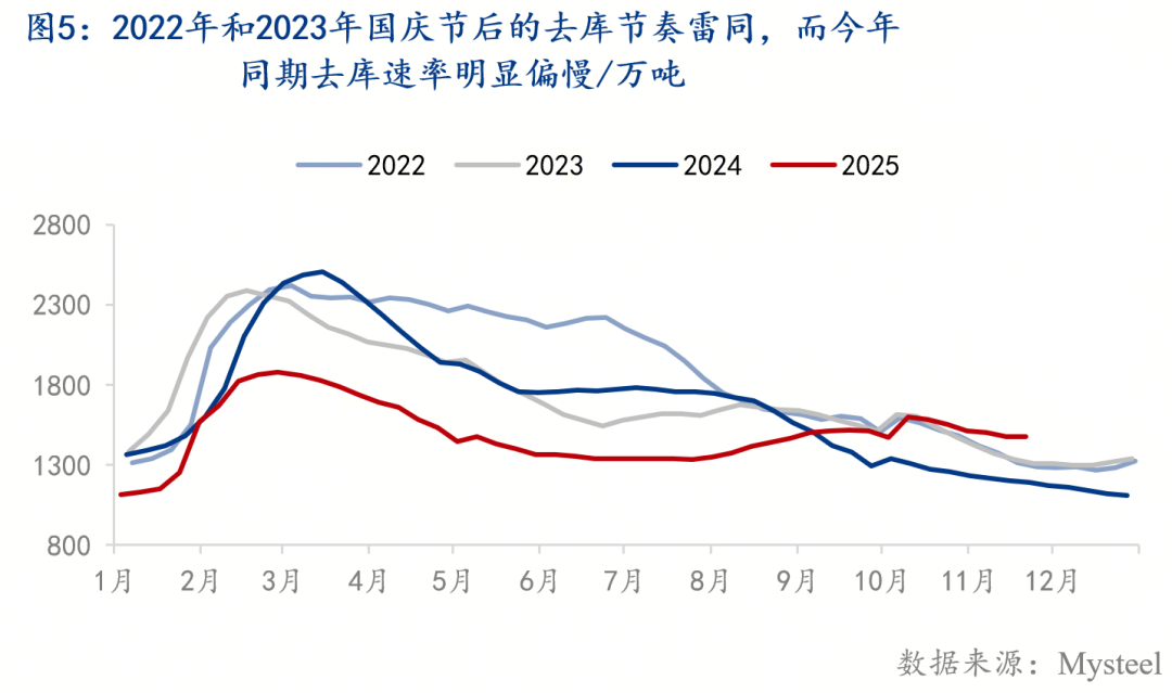 由于今年國慶節后,五大鋼材總庫存高點與2022年、2023年的同期水平相當,且2022年和2023年國慶節后的五大鋼材去庫節奏雷同(如下圖5),因此我們通過錨定這兩年國慶節后的去庫節奏,來判斷今年國慶節后五大鋼材去庫是否健康。