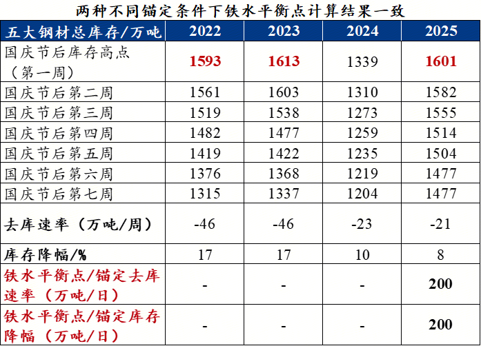 首先,從庫存去庫速率的角度來看:經過計算,今年國慶節后五大鋼材總庫存從高點1601萬噸降至當前水平1477萬噸的過程中,其去庫速率為21萬噸/周;然而,2022年同期去庫速率為46萬噸/周,2023年同樣為46萬噸/周,因此這兩年的去庫速率均值在46萬噸/周。可以看到今年國慶節后的去庫速率要少了26萬噸/周,也就說五大鋼材產量相比需求要多出了22萬噸/周;若想要今年國慶節后的去庫速率與2022年、2023年的去庫速率均值相當,那么通過推算得出,鐵水產量需要從國慶后的高點242萬噸/日降至約200萬噸/日附近,才能夠實現去庫速率的趨同。其次,若從去庫降幅的角度來看:今年國慶節后五大鋼材總庫存從高點1601萬噸降至當前水平1477萬噸的過程中,其降幅為8%;然而,2022年同期降幅為17%,2023年同期降幅為17%,因此這兩年的庫存降幅均值為17%。很顯然,今年的庫存降幅明顯要低于2022年和2023年的同期水平。若錨定這兩年的降幅均值17%,那么經過計算,國慶節后相同的去庫時間內,今年五大鋼材總庫存要少去庫了約153萬噸,也就說五大鋼材產量相比需求要多出了153萬噸。若把多出來的153萬噸轉換成鐵水產量,那么鐵水產量需要從國慶后的高點242萬噸/日同樣降至約200萬噸/日附近。在兩種不同的錨定條件下,鐵水平衡點計算的結果卻是一樣的,核心原因在于今年與2022年、2023年國慶節后的庫存高點水平相近。同時,對于當前236萬噸/日的日均鐵水而言,理論上仍將有約36萬噸的減產空間。