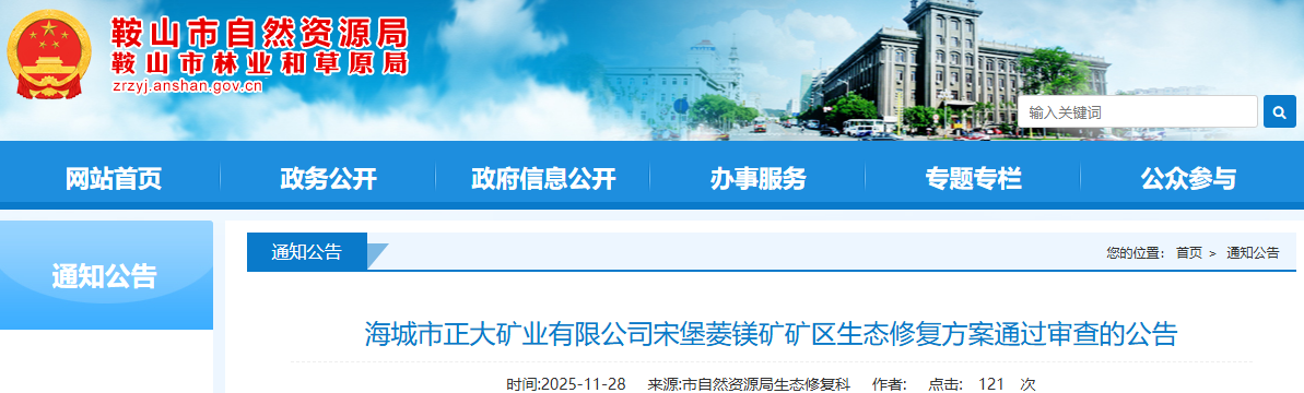 根據《遼寧省自然資源廳關于〈中華人民共和國礦產資源法〉實施衘接過渡期礦區生態修復方案評審工作的公告》、《遼寧省自然資源廳關于印發<礦山地質環境保護與土地復墾方案省級審查管理辦法(試行)>的通知》(遼自然資發〔2022〕129號)有關要求,《海城市正大礦業有限公司宋堡菱鎂礦礦區生態修復方案》通過審查,現予公告。