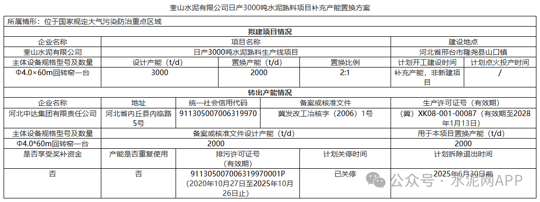 根據公示,奎山水泥日產3000噸水泥熟料生產線項目原生產線備案產能2000t/d,補充產能后為3000t/d,置換比例為2:1。河北中達集團有限責任公司2000t/d熟料線用于本項目置換產能,計劃2025年6月30日前拆除退出。