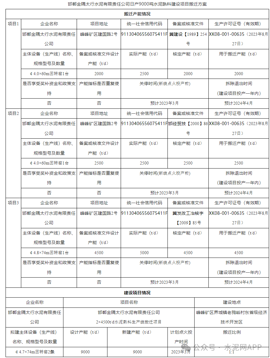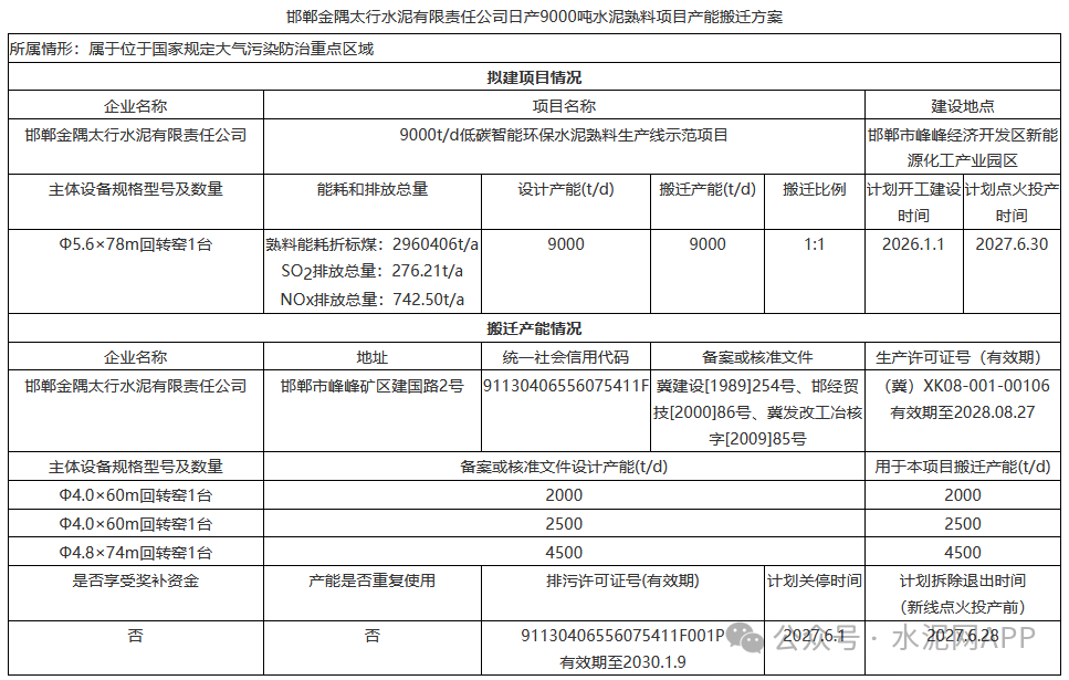 公告顯示,邯鄲金隅太行水泥擬建9000t/d低碳智能環保水泥熟料生產線示范項目,退出產能來自同公司一條2000t/d、一條2500t/d、一條4500t/d,置換比例1:1。計劃開工建設時間2026年1月1日,計劃點火投產時間2027年6月30日。
